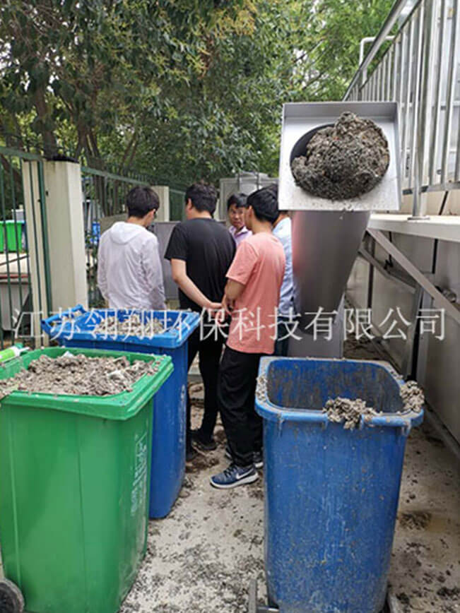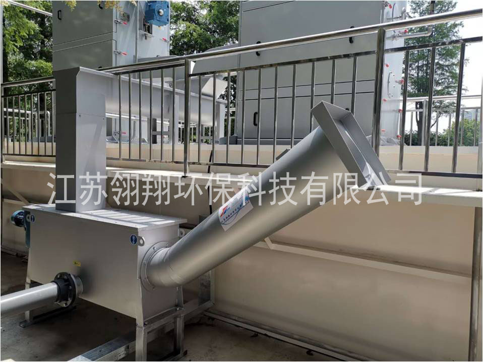 此裝置用于對格柵濾渣中的溶解物質(zhì)進行連續(xù)沖洗處理,然后進行脫水/壓榨處理之后運輸出去。進入裝置的格柵濾渣直接來自格柵機械(階梯格柵等類型的格柵),或通過其他濾渣運輸機械(輸送機等)。待處理的格柵濾渣直接投入螺旋壓榨機的料斗,螺旋壓榨螺旋桿開始啟動工作,將濾渣進行輸送壓榨脫水處理運行。與此同時,每隔一定時間螺旋壓榨機沖洗器向料斗和螺管內(nèi)注入沖洗水,對濾渣中有機物質(zhì)進行有效沖洗。沖洗水連同溶解物質(zhì)一起穿流螺管底部的篩網(wǎng),流入污水處理場的進水渠道。本裝置和階梯格柵機或轉(zhuǎn)格柵組合使用,將集過濾、壓榨一體化全閉運行。