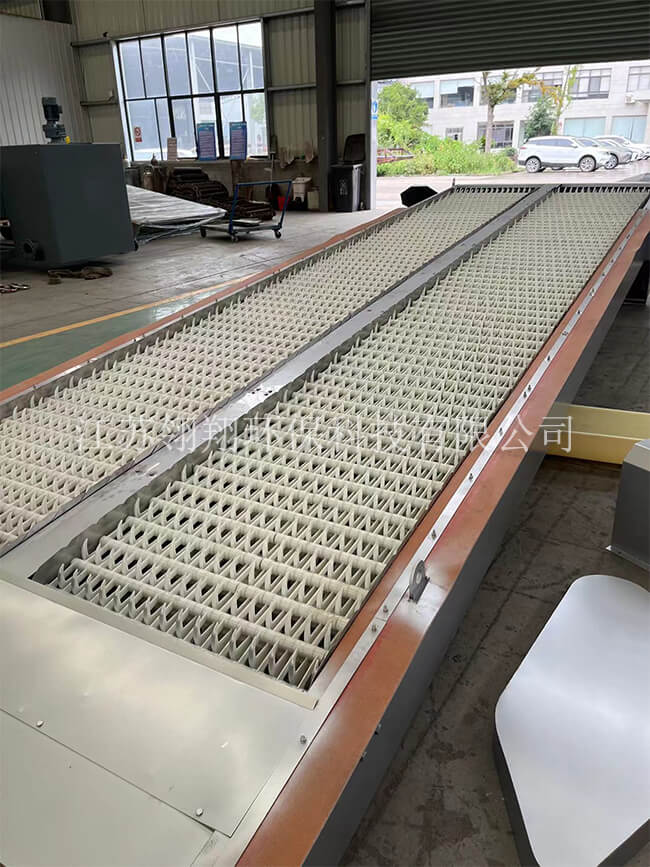 回轉(zhuǎn)式粗格柵是由一種奇特的耙齒廠裝配成一組回轉(zhuǎn)格柵鏈。在電機減速器的驅(qū)動下,耙齒鏈進行逆水流方向回轉(zhuǎn)運動。耙齒鏈運轉(zhuǎn)到設(shè)備的上部時,由于槽輪和彎軌的導(dǎo)向,使每組耙齒之間產(chǎn)生相對自清運動,絕大部分固體物質(zhì)靠重力落下。另一部分則依靠清掃器的反向運動把粘在耙齒上的雜物清掃干凈。按水流方向耙齒鏈類同于格柵,在耙齒鏈軸上裝配的耙齒間隙可以根據(jù)使用條件進行選擇。當(dāng)耙齒把流體中的固態(tài)懸浮物分離后可以保證水流暢通流過。整個工作過程是連續(xù)的,也可以是間歇的。